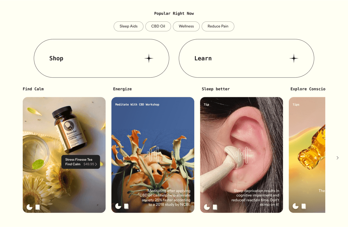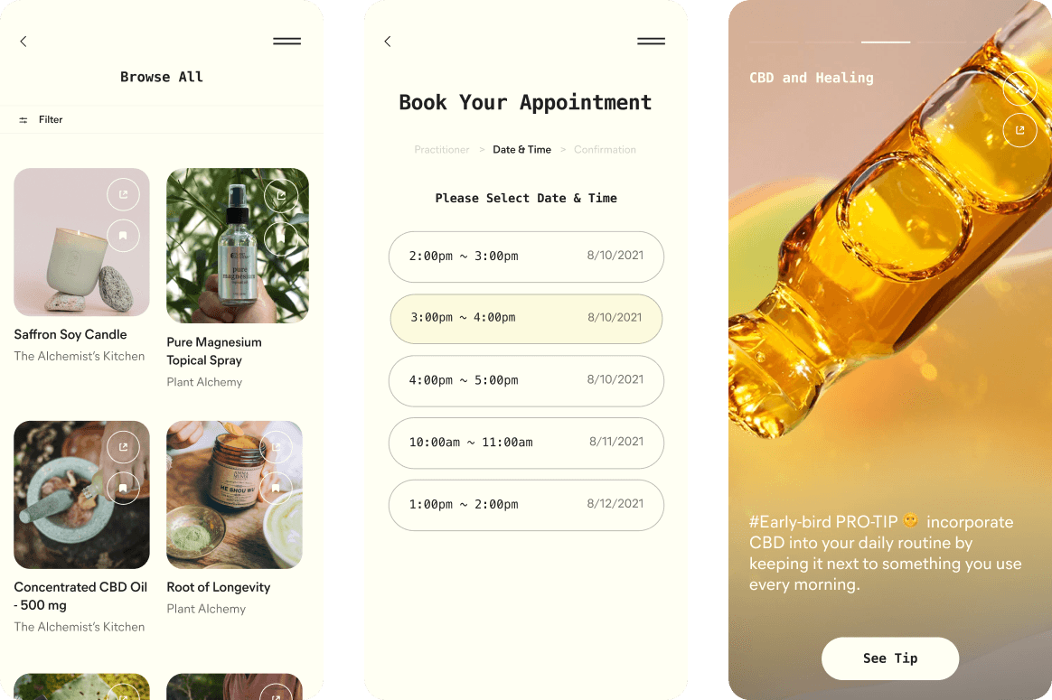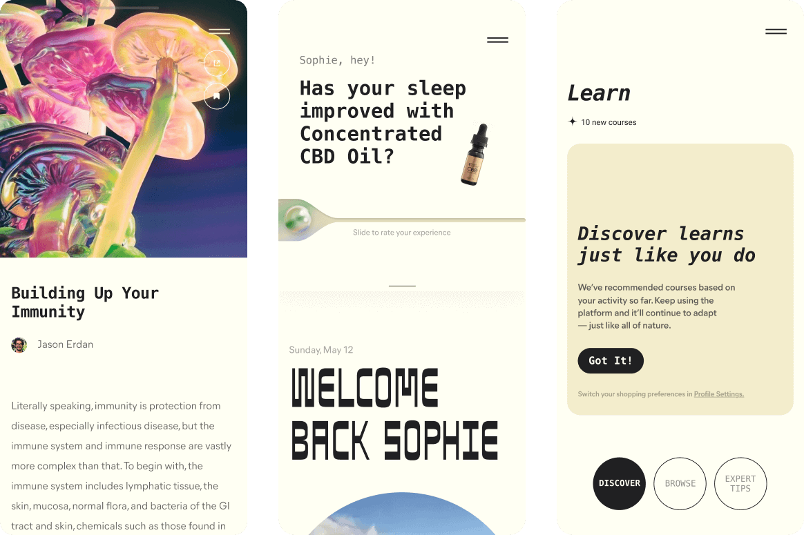 FW extended the new Visual Identity system into an immersive platform combining education, commerce and community. The idea was to hold the Users hand through the deeply personal journey that is New Wellness and Psychedelic Therapy.